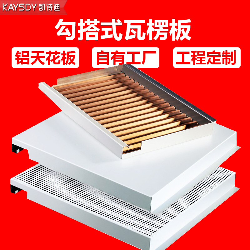 勾搭鋁單板天花板面平整,一般為單向平行龍骨勾搭式結構,板與板之間的拼接時通過龍骨有次序搭折在一起的,板邊特的勾搭設計,能很好的控制板與板之間的活動性,從而確保了板與板之間的縫隙風嚴密平整拼縫細密,棱線分明,不同寬度可實現多種組合。